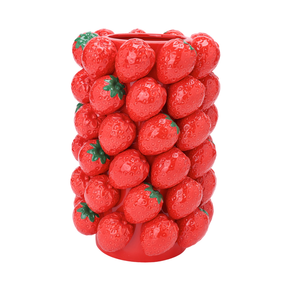 Deze unieke designvaas is een ware ode aan de aardbei! Het hele oppervlak is bedekt met driedimensionale aardbeien, waardoor het object van alle kanten een speels en opvallend karakter heeft. De rijke textuur en het vrolijke ontwerp maken deze vaas niet alleen functioneel, maar ook een echte blikvanger in elk interieur.