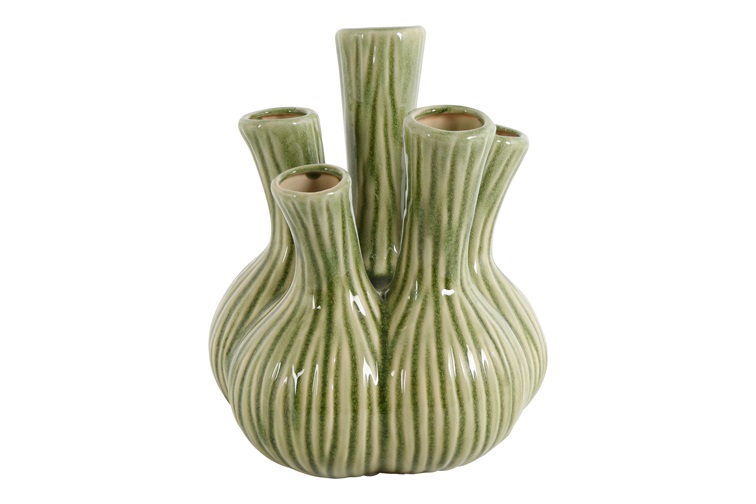 Tulpenvaas Fabio Bulb L is een opvallende keramieken vaas met een organisch en speels ontwerp. Deze uitvoering heeft vijf openingen, waardoor u tulpen, losse bloemen of decoratieve takken mooi verdeeld kunt schikken. De donkergroene kleur met subtiele verticale lijnen geeft de vaas een natuurlijke, stijlvolle uitstraling.