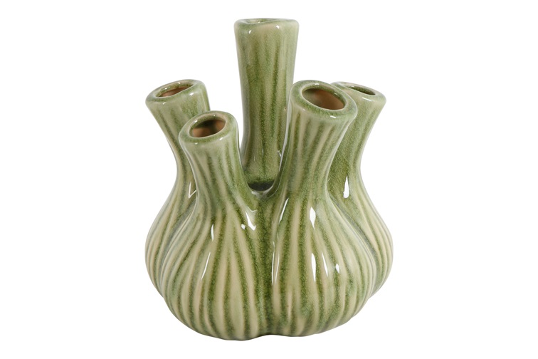 Tulpenvaas Fabio Bulb S is een compacte keramieken vaas met een speels en organisch design. Dankzij de vijf afzonderlijke openingen is deze tulpenvaas ideaal voor het stijlvol verdelen van tulpen, losse bloemen of kleine takjes. De donkergroene kleur met subtiele verticale lijnen geeft de vaas een natuurlijke en elegante uitstraling.