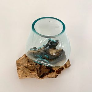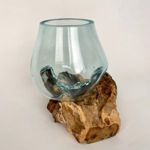 Glazen vaas op wortelhout ±15cm. Prachtig decorstuk van een glasgeblazen vaas op een stuk wortelhout. Zeer stijlvol en past in ieder interieur. Op verschillende manieren te gebruiken. Puur als decoratie, met een plantje erin, een mooi object erin, lichtjes, schelpen, gekleurd zand, water of water met een beetje ecoline. En er zullen uiteraard nog andere ideeën zijn.