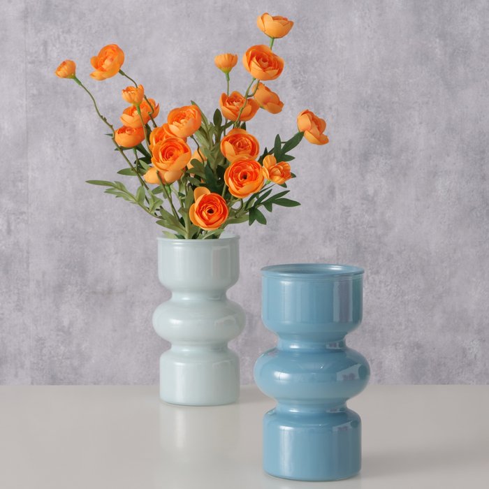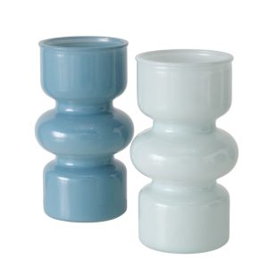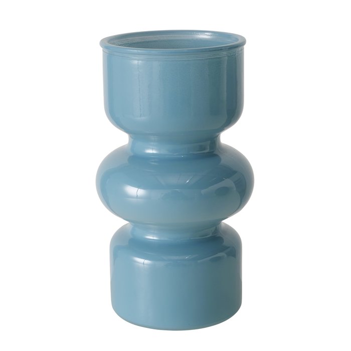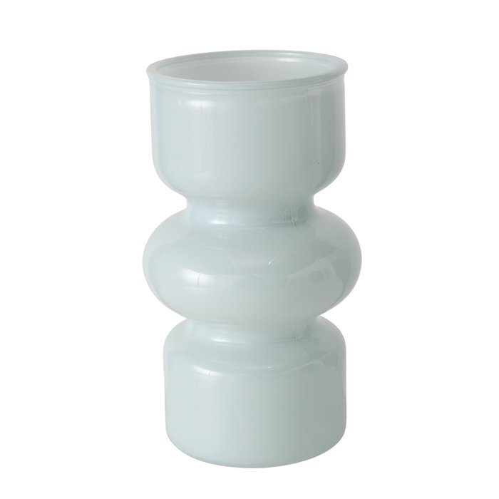 Vaas Maika is een stijlvolle glazen vaas met een opvallend rond design en een zachte milky afwerking. Deze uitvoering is verkrijgbaar in twee verschillende blauwtinten, wat zorgt voor een frisse en moderne uitstraling in het interieur.