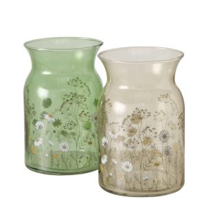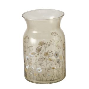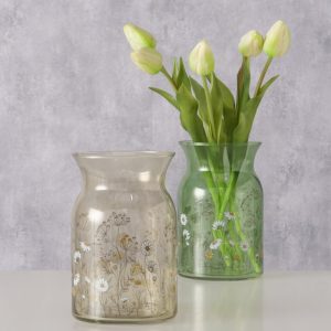 De vaas is gemaakt van gelakt glas en heeft een hoogte van ca. 20,4 cm en een diameter van ca. 13 cm. Het floral design rondom zorgt voor een landelijke en vrolijke uitstraling die goed past bij verschillende interieurstijlen.