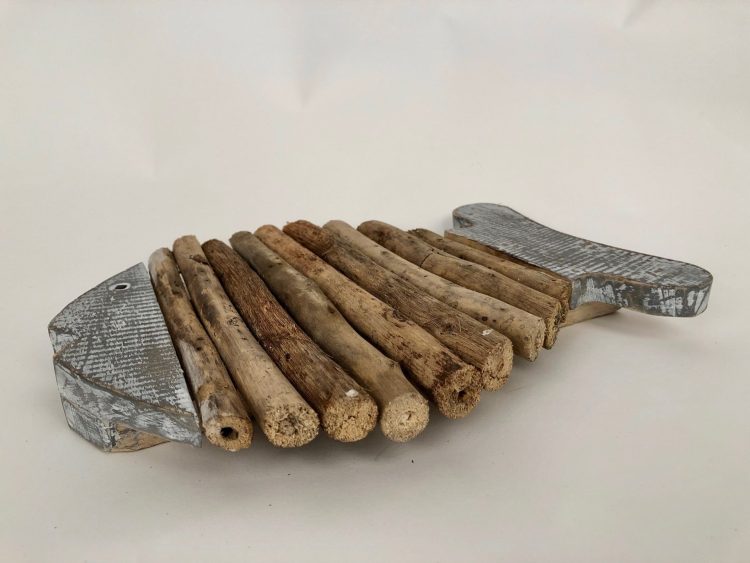 Houten vis pannen onderzetter met drijfhout (greywash). Handgemaakte pannen onderzetter van (drijf)hout, gestreept greywash/hout kleurig.