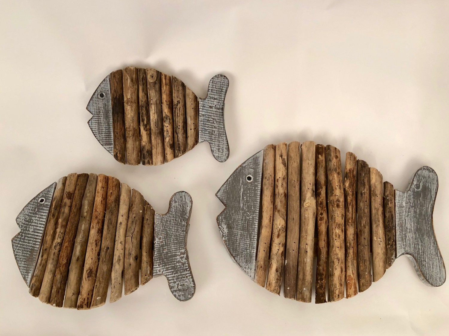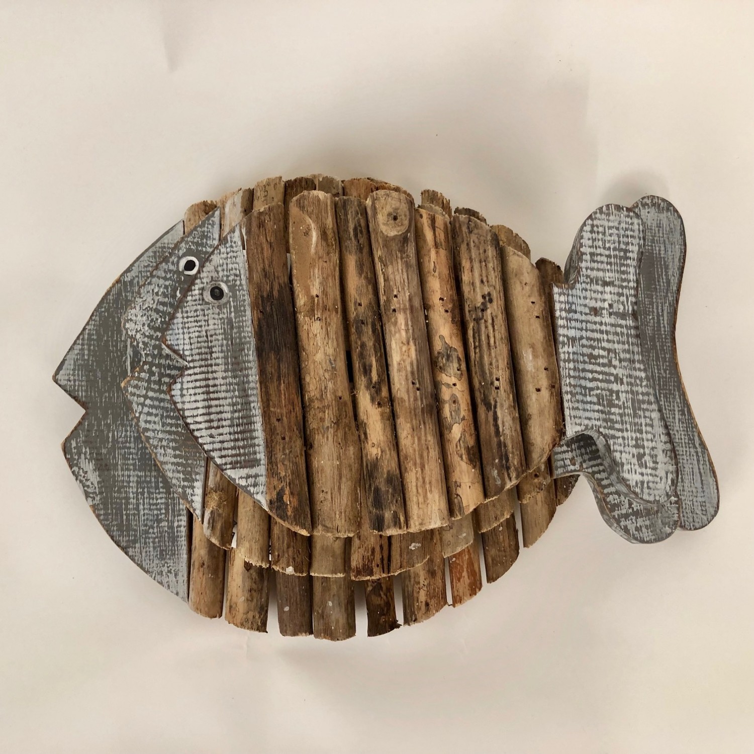 Houten vis pannen onderzetter met drijfhout (greywash) ±35 cm