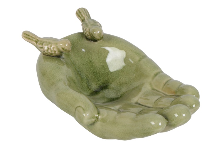 Dit bijzondere vogelvoeder in de vorm van een hand met twee vogeltjes is zowel functioneel als decoratief. De zachte rondingen en glanzende donkergroene afwerking geven het geheel een rustige, natuurlijke uitstraling. Perfect om neer te zetten op een tuintafel, balkon of tussen de planten in de tuin.