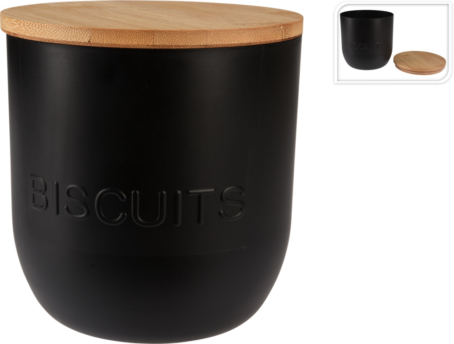 Deze moderne voorraaddoos combineert een strak zwart design met een natuurlijk houten deksel, een stijlvolle toevoeging aan elke keuken. Perfect om koekjes in te bewaren. De voorraaddoos is gemaakt van plastic.