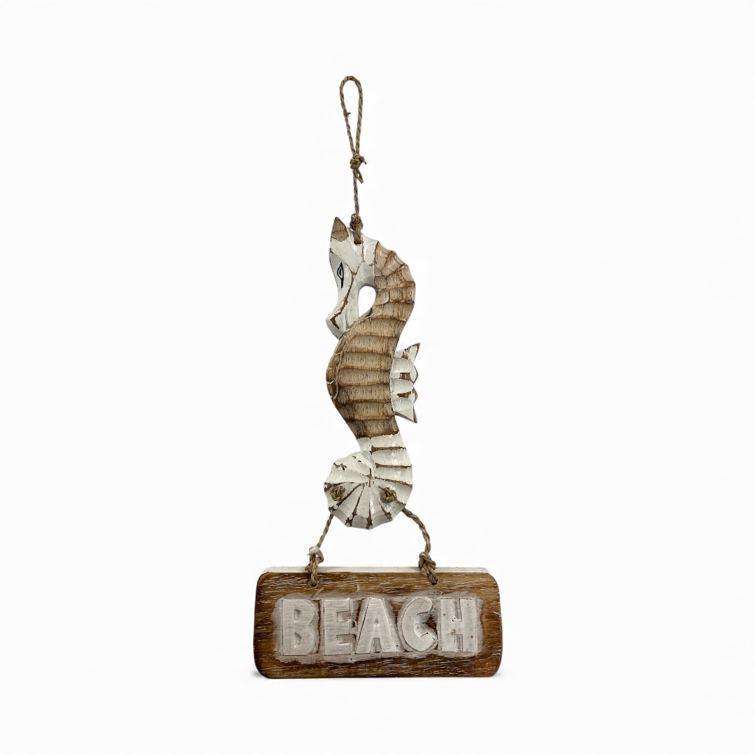 Wanddecoratie in de vorm van een zeepaard met de tekst “Beach” in bruin/wit van ca. 35×18?cm. Dit handgemaakte item geeft een speels en sfeervol nautisch accent aan je interieur en past perfect bij een beach, coastal of landelijke woonstijl. Ideaal om op te hangen aan een wand in de woonkamer, slaapkamer of hal voor een vrolijke, maritieme touch.
