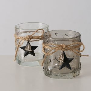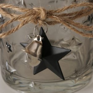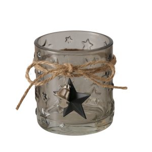 Deze prachtige glazen theelichthouder straalt warmte en elegantie uit. Het glas heeft een verfijnd reliëf dat het licht mooi laat dansen, terwijl de zilveren ster en het jingle bells belletje zorgen voor een subtiel feestelijk accent. Afgewerkt met een lieflijk strikje, vormt dit windlichtje een perfecte combinatie van stijl en gezelligheid.