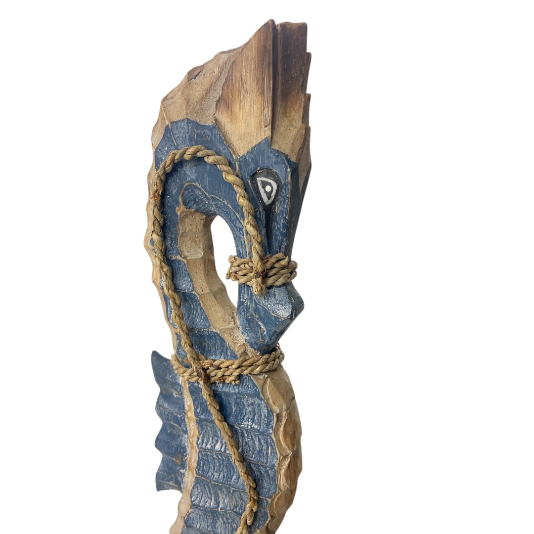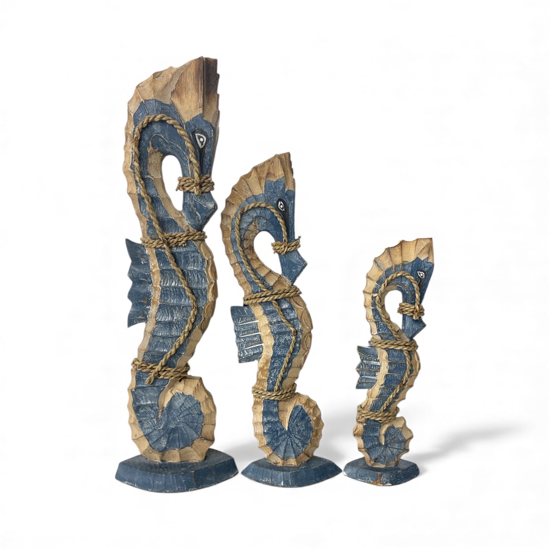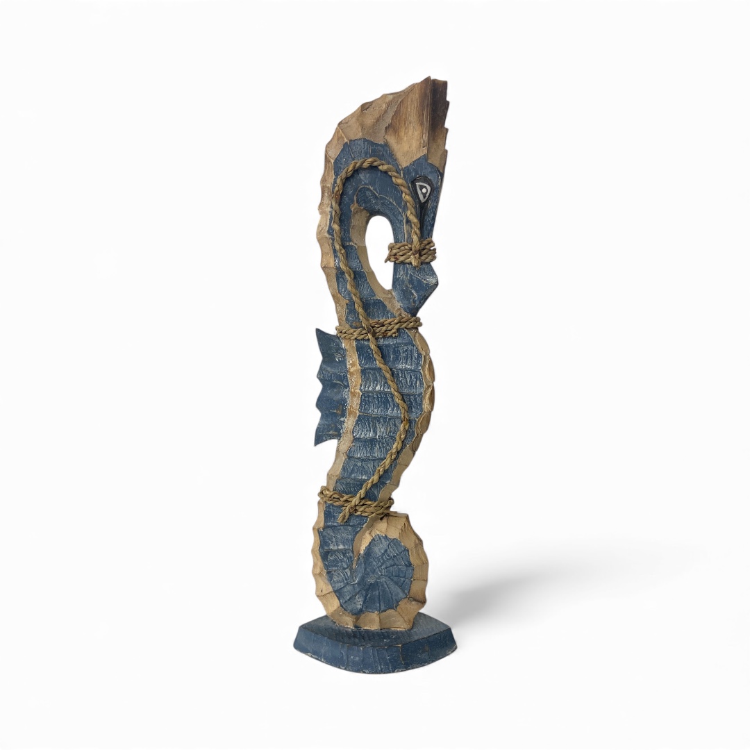 Dit grote donkerblauwe zeepaard is een indrukwekkend decoratiestuk voor iedereen die houdt van een uitgesproken maritieme of nautische woonstijl. De diepe blauwe kleur geeft het beeld een luxe en krachtige uitstraling, terwijl het natuurlijke hout zorgt voor balans en warmte. Dit formaat komt perfect tot zijn recht op grotere oppervlakken zoals een brede kast, haltafel, trapbordes of veranda. Combineer het met touw, glaswerk, schelpen en andere oceaan-geïnspireerde items voor een prachtig totaalplaatje.