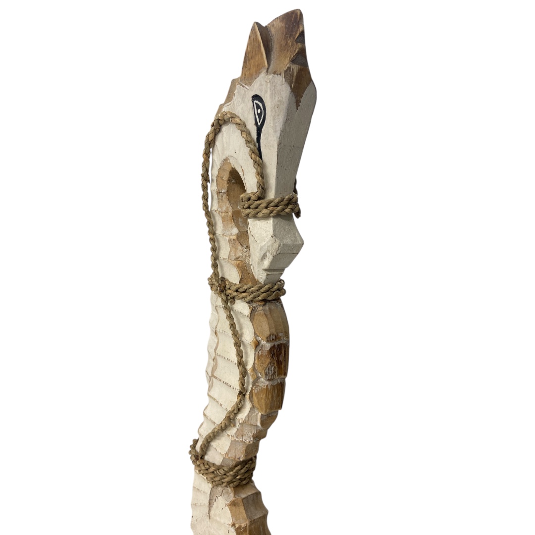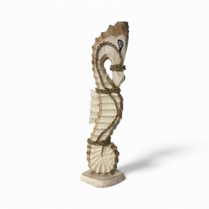 Dit grote witte houten zeepaard is een prachtig en stijlvol showpiece. De lichte kleuren zorgen voor een serene, luxe uitstraling die perfect past bij een modern beach house, landelijke woonstijl of lichte interieurtrend. Het formaat maakt het ideaal om een hoek van de kamer op te vullen of een kast, wandtafel of veranda extra sfeer te geven.