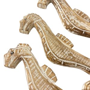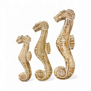 Deze set van drie houten zeepaardjes wandhangers in naturel houtkleur geeft een warme en rustige uitstraling aan je interieur. De natuurlijke look maakt ze perfect voor een beachy, landelijk of neutraal woonstijltje. Dankzij de haakjes aan de achterkant zijn ze eenvoudig op te hangen als set bij elkaar of los van elkaar op verschillende plekken in huis, zoals in de woonkamer, badkamer of hal.