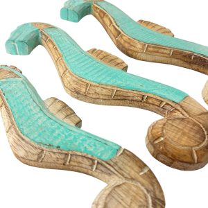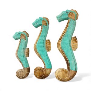 Deze set van drie houten zeepaardjes wandhangers in turquoise tinten geeft een frisse, zomerse en strandachtige uitstraling aan je interieur. De combinatie van turquoise met naturel hout zorgt voor een speels en vrolijk accent aan de muur. Dankzij de haakjes aan de achterkant kun je de zeepaardjes eenvoudig ophangen als complete set of los van elkaar op verschillende plekken in huis.